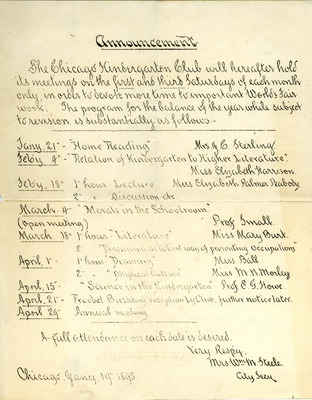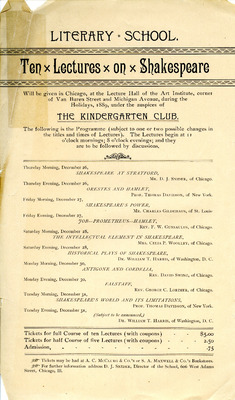 An announcement of special courses offered by the Chicago Kindergarten College in the Fall of 1898 and Winter of 1899. The courses focus on the philosophy of Fredrich Froebel's kindergarten education, the psychology of children, arts and physical education, and classic world literature.