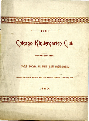 Program for the Chicago Kindergarten Club, 1889. Includes club leadership information, with Elizabeth Harrison listed as president, and also includes constitution and by-laws, membership lists, and department reports.