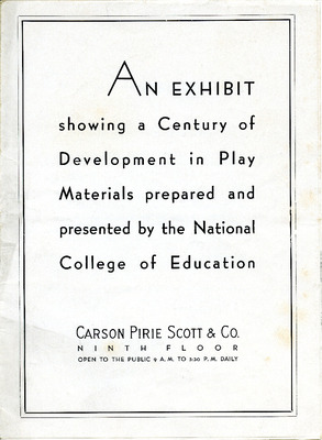 A program describing the toy exhibit developed by students and faculty from the National College of Education that was exhibited during the 1933 Chicago World's Fair, Century of Progress on the 9th floor of Carson Pirie Scott & co. on State Street.
